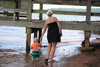 After playing a little while longer we headed down to the little beach area to watch Josh ride the jet ski. Wade was in heaven throwing rocks and playing in the lake. I had to put his life jacket on because he was getting so brave and walking out pretty deep. He even put his face down in the water a couple of times. I can't wait for next summer when he is a little bigger...hopefully he will still love the water. Here are some pictures of all of us playing. My dad had to head home early for a cookout so it was just the 4 of us. I just love the black and white picture of Wade running away from Josh and laughing. It just makes me smile. I was so glad he finally started feeling a little more like himself!